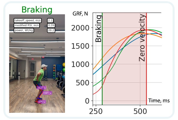 The braking phase is crucial for setting up the subsequent stages of the CMJ. Efficient braking allows athletes to better prepare for the transition into the zero-velocity and push-off phases, ultimately improving overall jump performance. In fact, the energy absorbed during braking directly impacts the energy generated in the following phases, as seen in the equivalence of their force-time curve areas. Athletes who struggle with this phase often show reduced efficiency in their movements, which can limit explosive power and overall jump height. By analyzing the braking phase, coaches and athletes can identify areas for improvement and optimize movement patterns for better results.