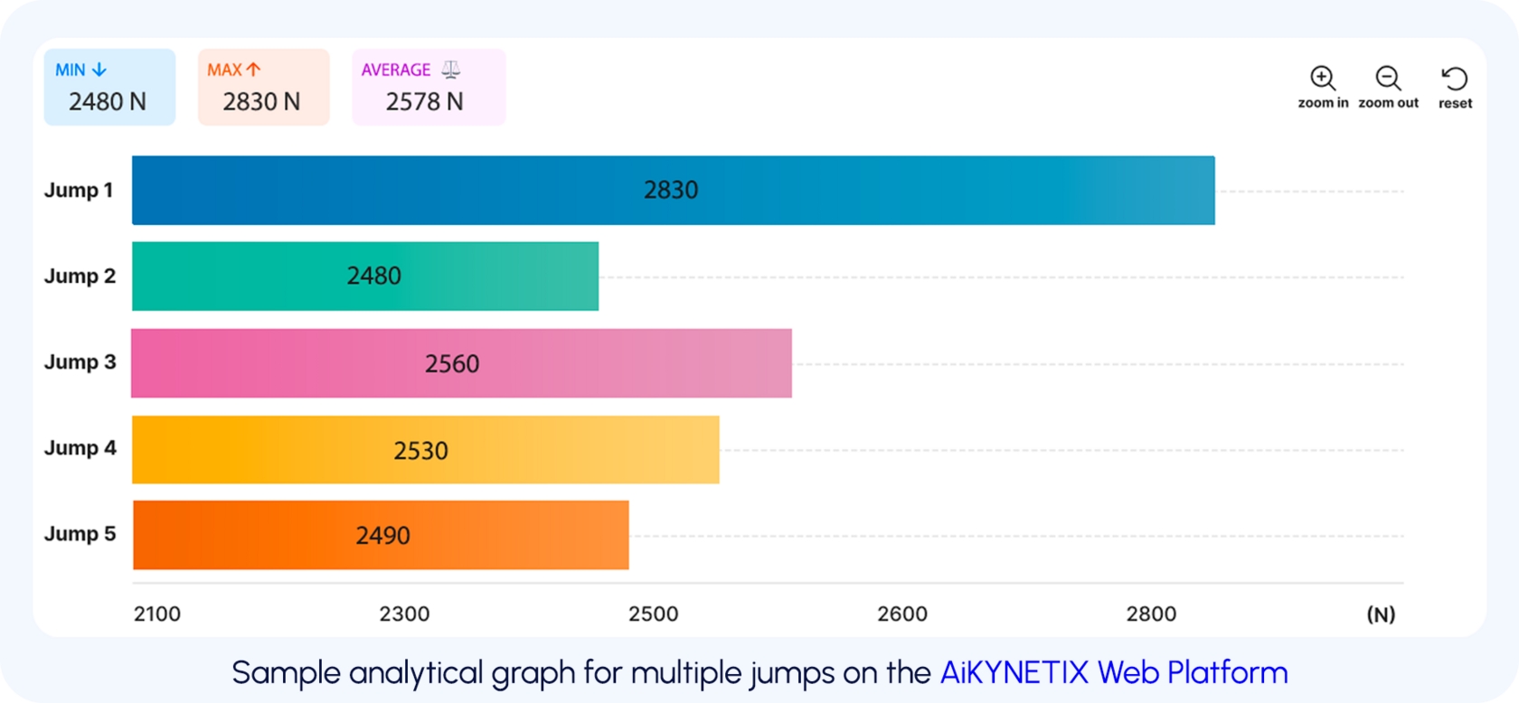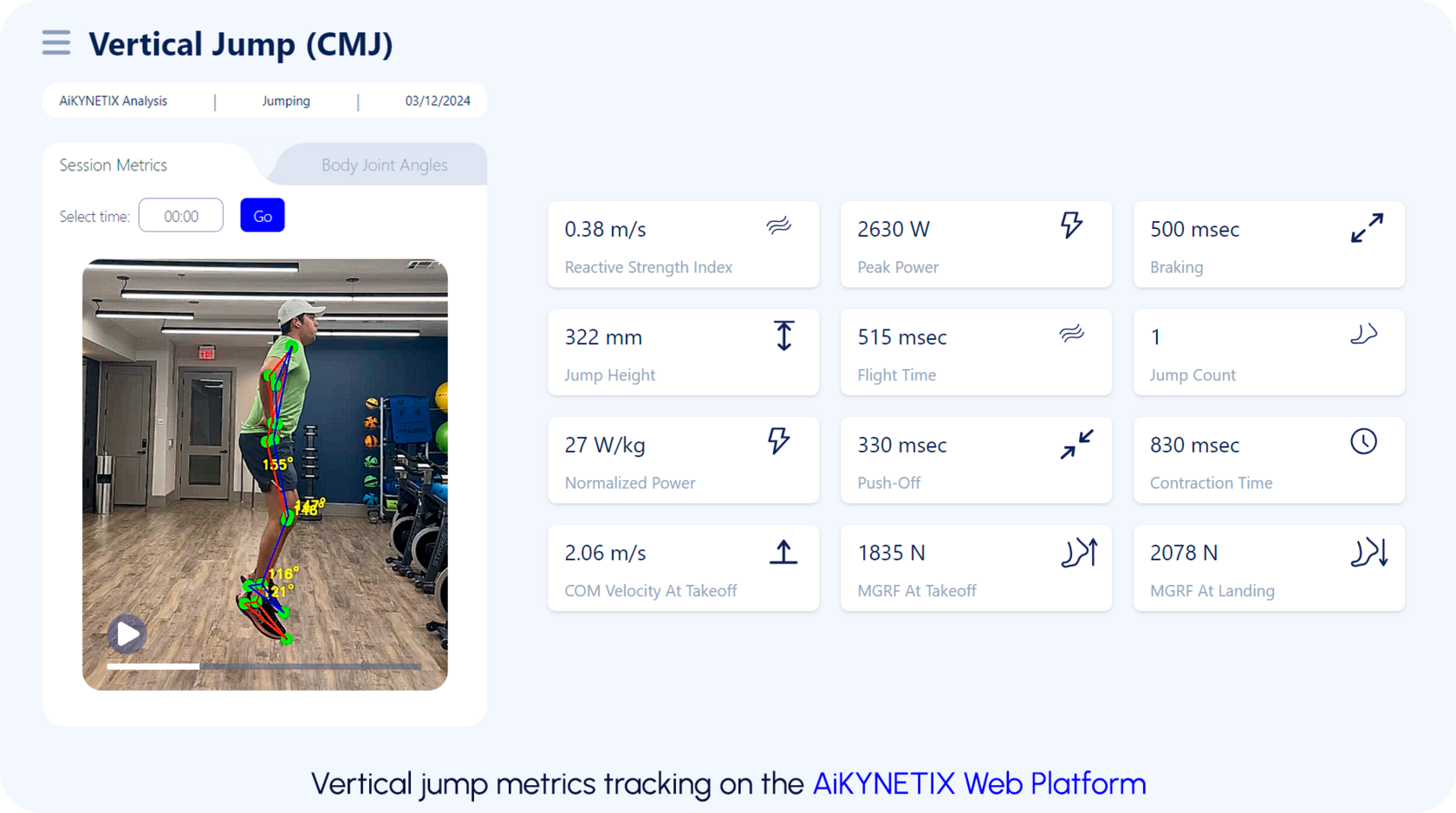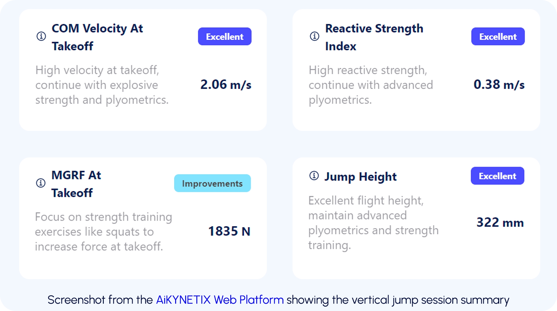 Summary & Feedback: At the top, you’ll find an expandable feedback window containing general observations. For example, it might note, “Great consistency in jump height, but work on reducing landing impact.” This feedback is generated by our Gen AI based on your performance metrics.
