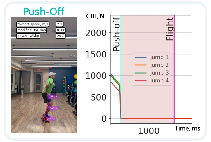This phase is a critical measure of an athlete's ability to generate force and power effectively. Key metrics analyzed during the push-off phase include average or peak relative propulsive force and power.