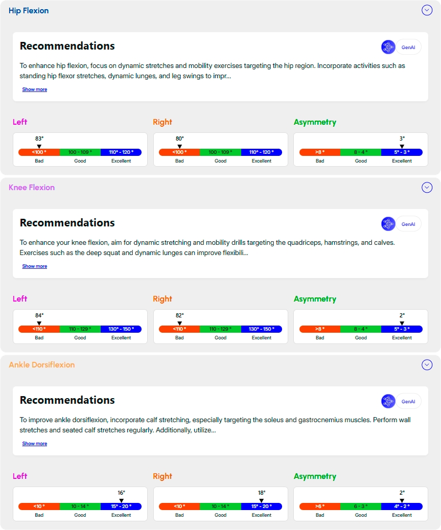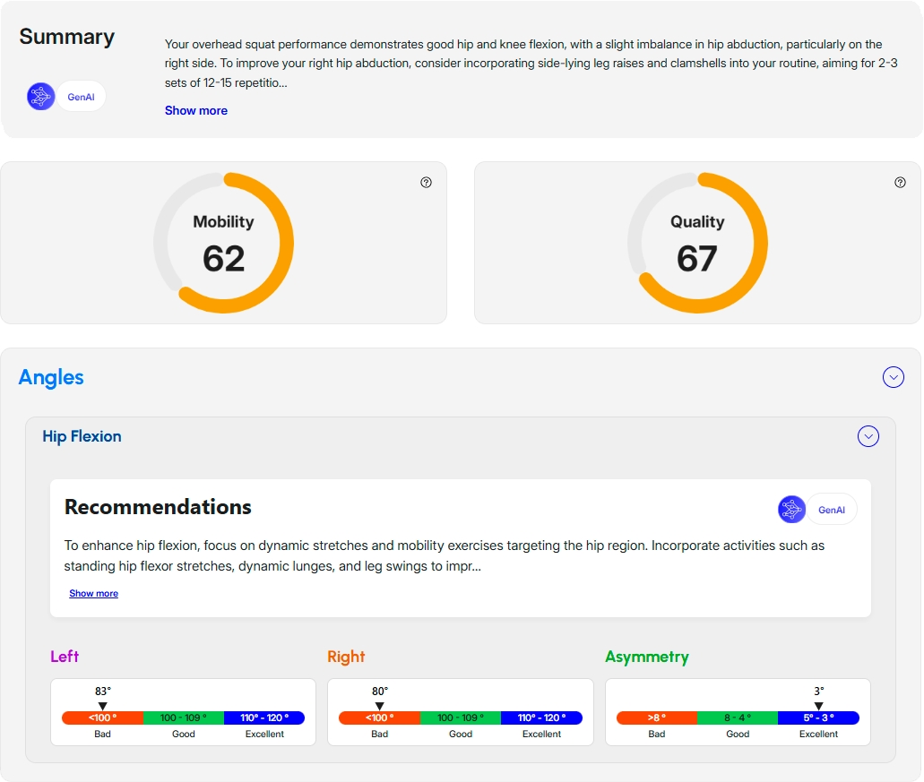 Takeaway: Use this data to personalize training or rehab. Too much depth without mobility? Fix it. Knee‑heavy mechanics? Shift your torso—all based on real numbers.