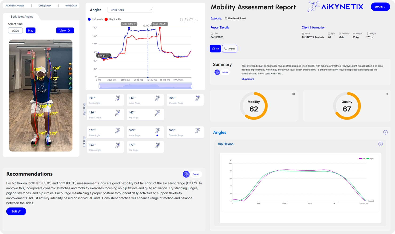 The AiKYNETIX Web Platform uses computer vision and AI to measure biomechanics during overhead squats using a simple smartphone video. It generates objective reports with real‑time recommendations—for everyone from rehab patients to elite athletes.