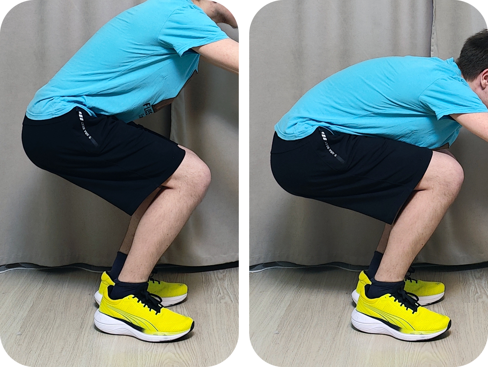 Squatting beyond available hip flexion results in posterior pelvic tilt and lumbar stress.
